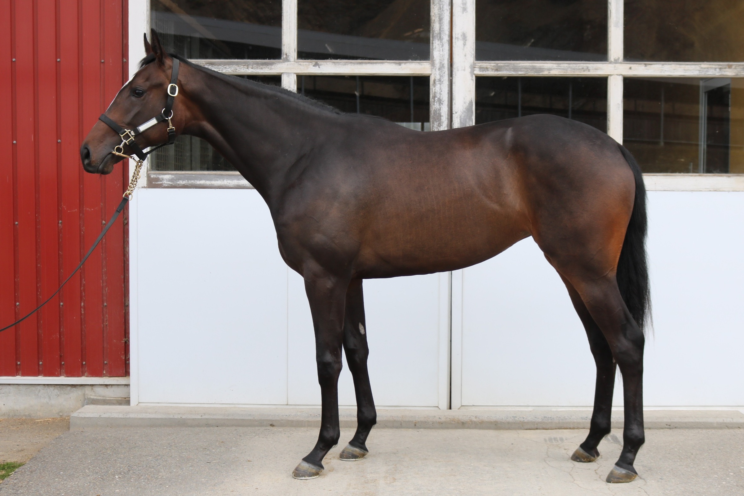 ・当地スタッフ 「緩やかな成長曲線を描く印象で、初期馴致へ取り掛かったのも終わりの方のグループ。教えた物事に納得するまで時間を要すものの、理解が深まるとスムーズに運びます。今はスローキャンターまで。血統馬らしい背中の良さを感じ取れる好素材です」